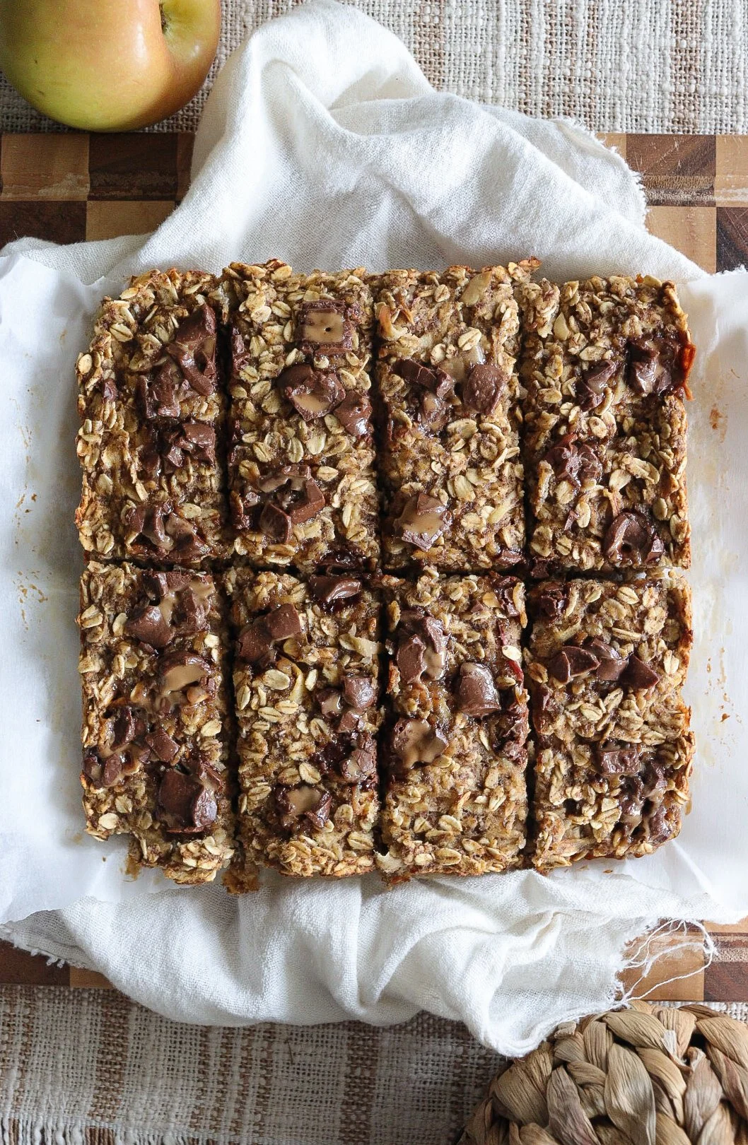 These Apple Pie Oat Bars are made with sweet honeycrisp apples, smooth applesauce, warm cinnamon, and delicious honey all mixed together with a chewy oat base and finished with chopped Rolos for a gooey caramel chocolate topping.They are great to meal prep for breakfast or snacks throughout the week!