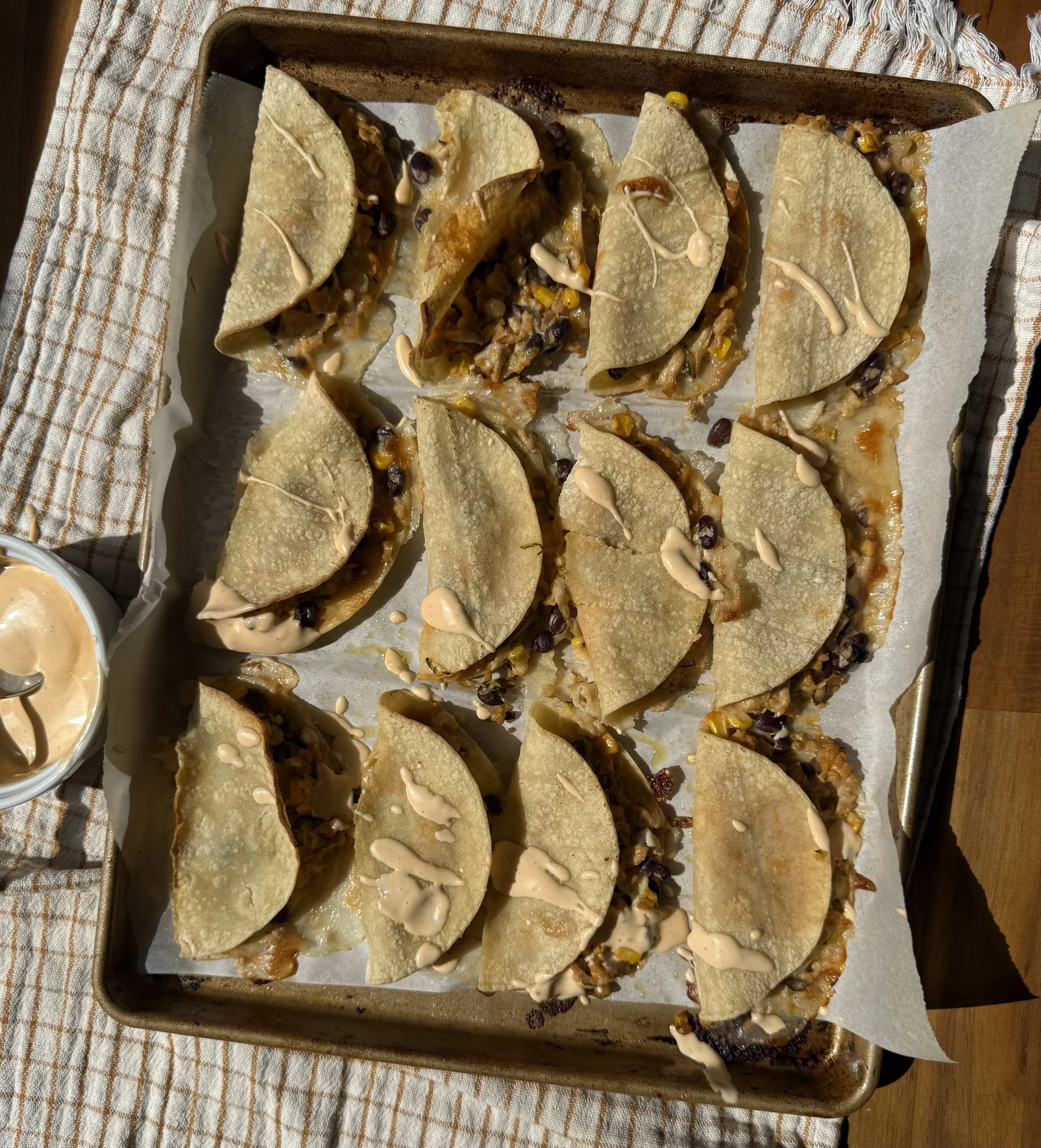 Let’s get to those baked tacos though. I recently tried the Kinder buffalo wing sauce and I love it so much I’ve been trying to find any excuse to use it. You can never go wrong with tacos! These baked buffalo chicken tacos are full of vegetables like corn, black beans, and shredded zucchini. They also have melty Oaxaca cheese that is the perfect creamy compliment to the spicy buffalo sauce. I love baked tacos because they have such a nice crunch! I served mine with a mix of ranch and buffalo dip.