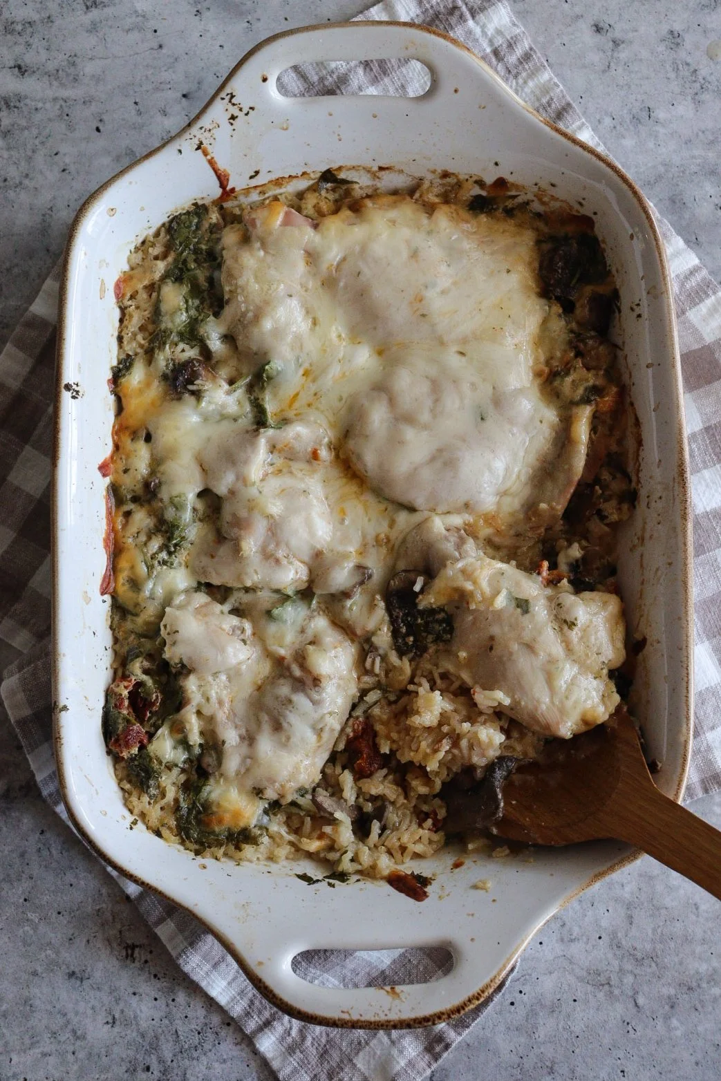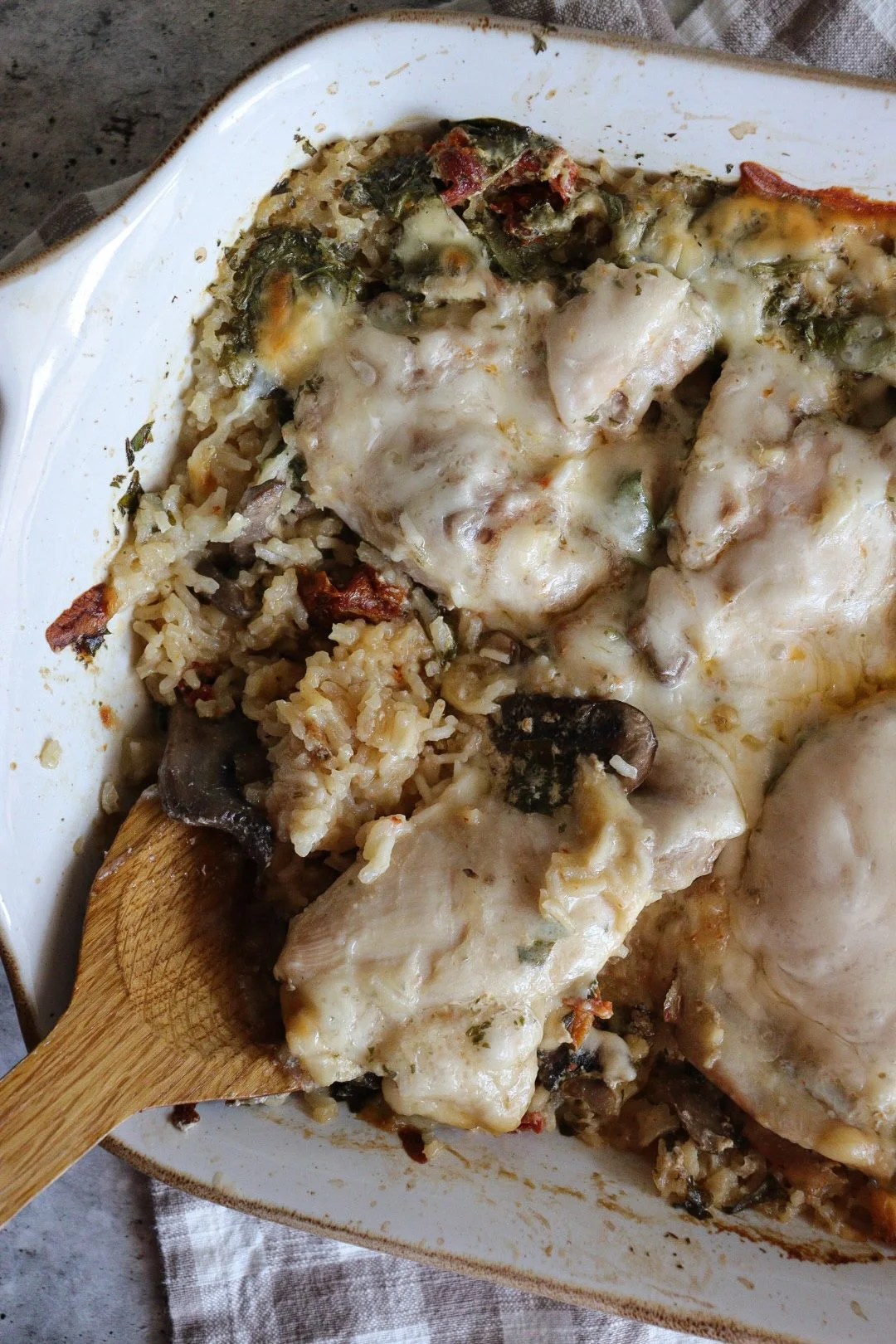 This creamy tuscan chicken rice bake is cozy and packed with Italian inspired flavors. The tender chicken thighs and fluffy rice are baked with mushrooms, spinach, and sun dried tomatoes. It's all topped with gooey mozzarella cheese that really brings it all together! This weeknight meal is cozy and hearty, the whole family will love it.