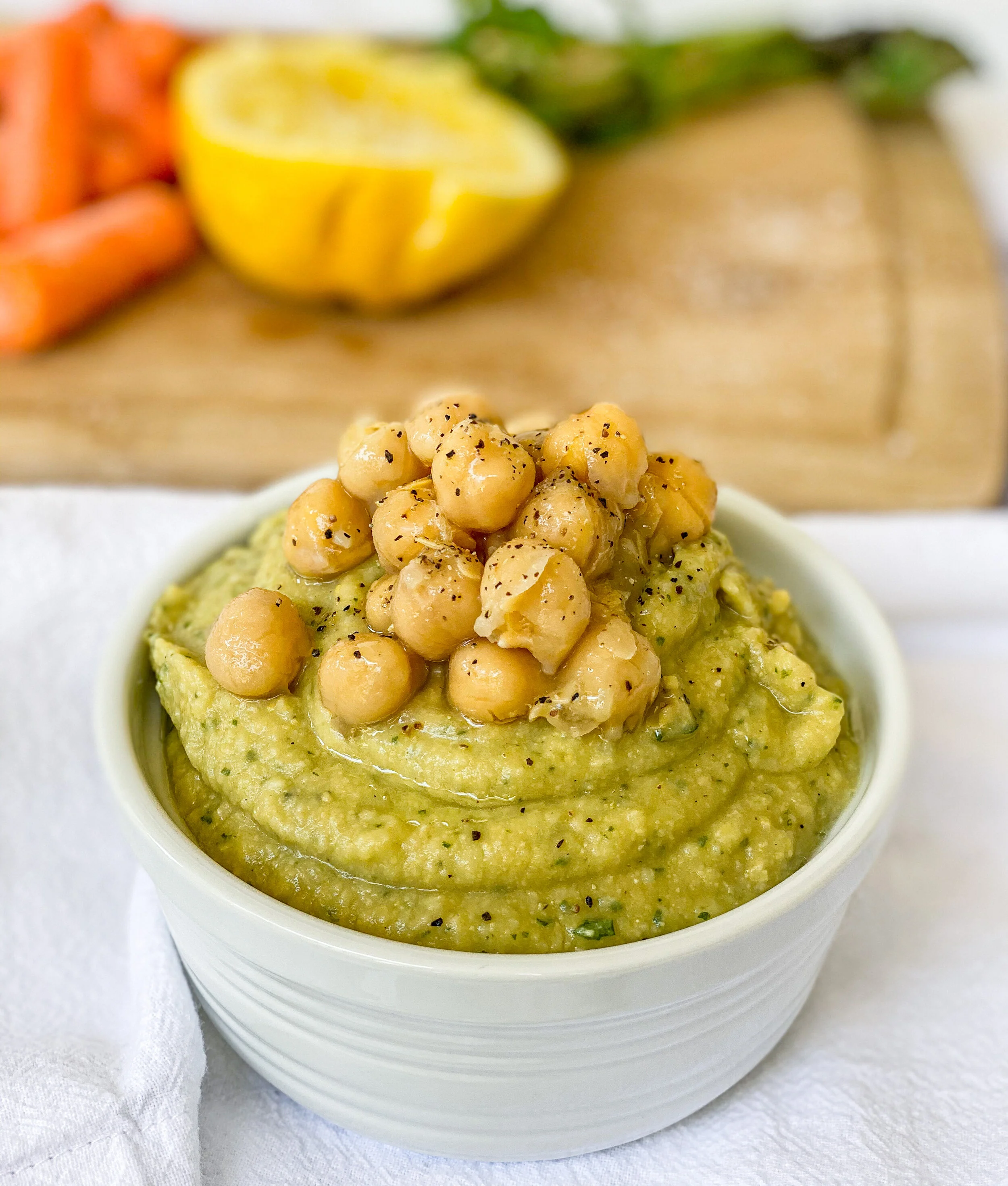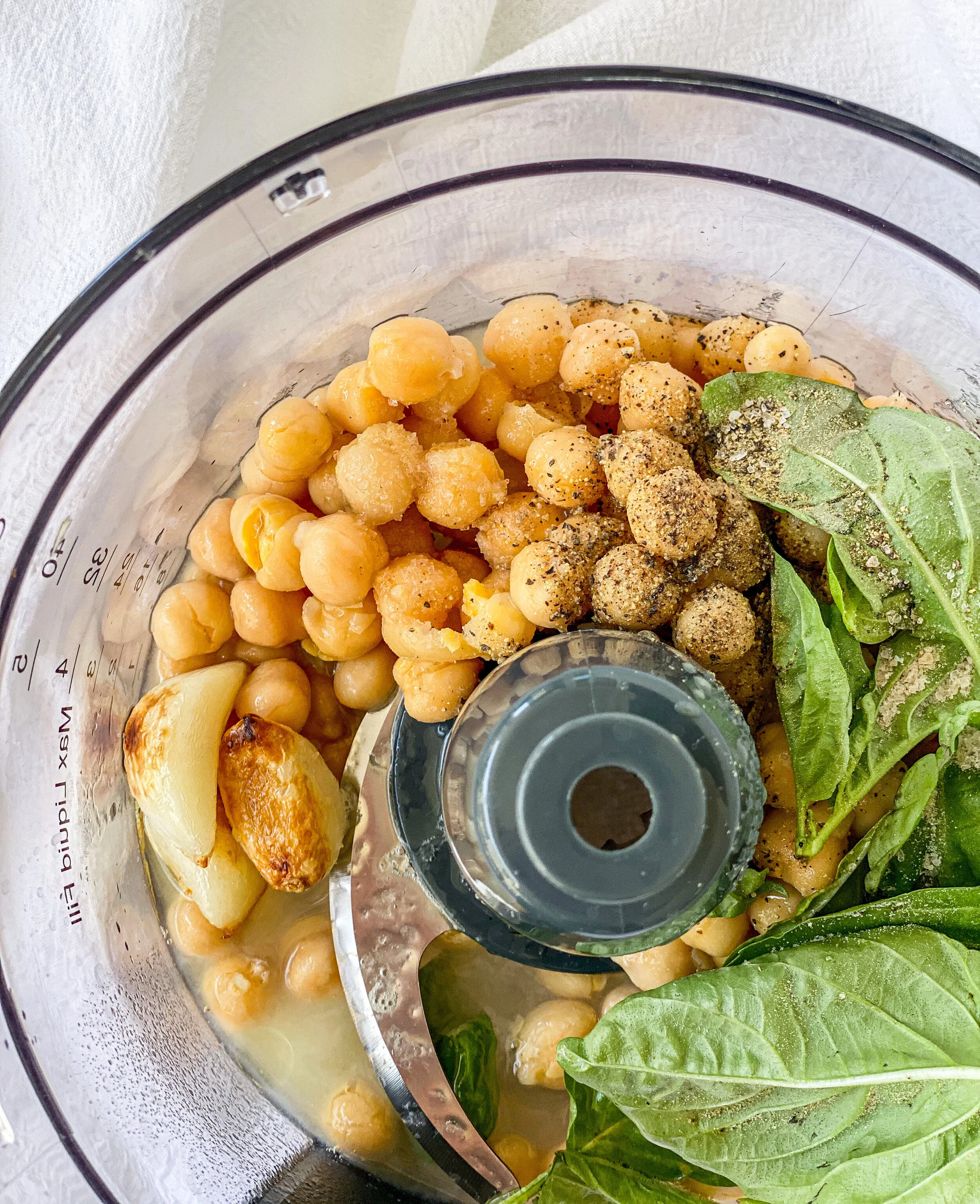 In a small skillet heat 1 tsp. avocado oil over medium heat. Sauté the garlic cloves for about 10 minutes, stirring so they do not burn (don’t worry about mincing them because you will put them in the food processor anyways). When the garlic is done put it in the food processor with the basil, chickpeas (set aside one spoonful of chickpeas to add on top at the end), aquafaba, lemon juice, salt and pepper. Blend until smooth! Top with chickpeas, avocado oil drizzle, and more black pepper. Enjoy with whatever you like to dip in your hummus!