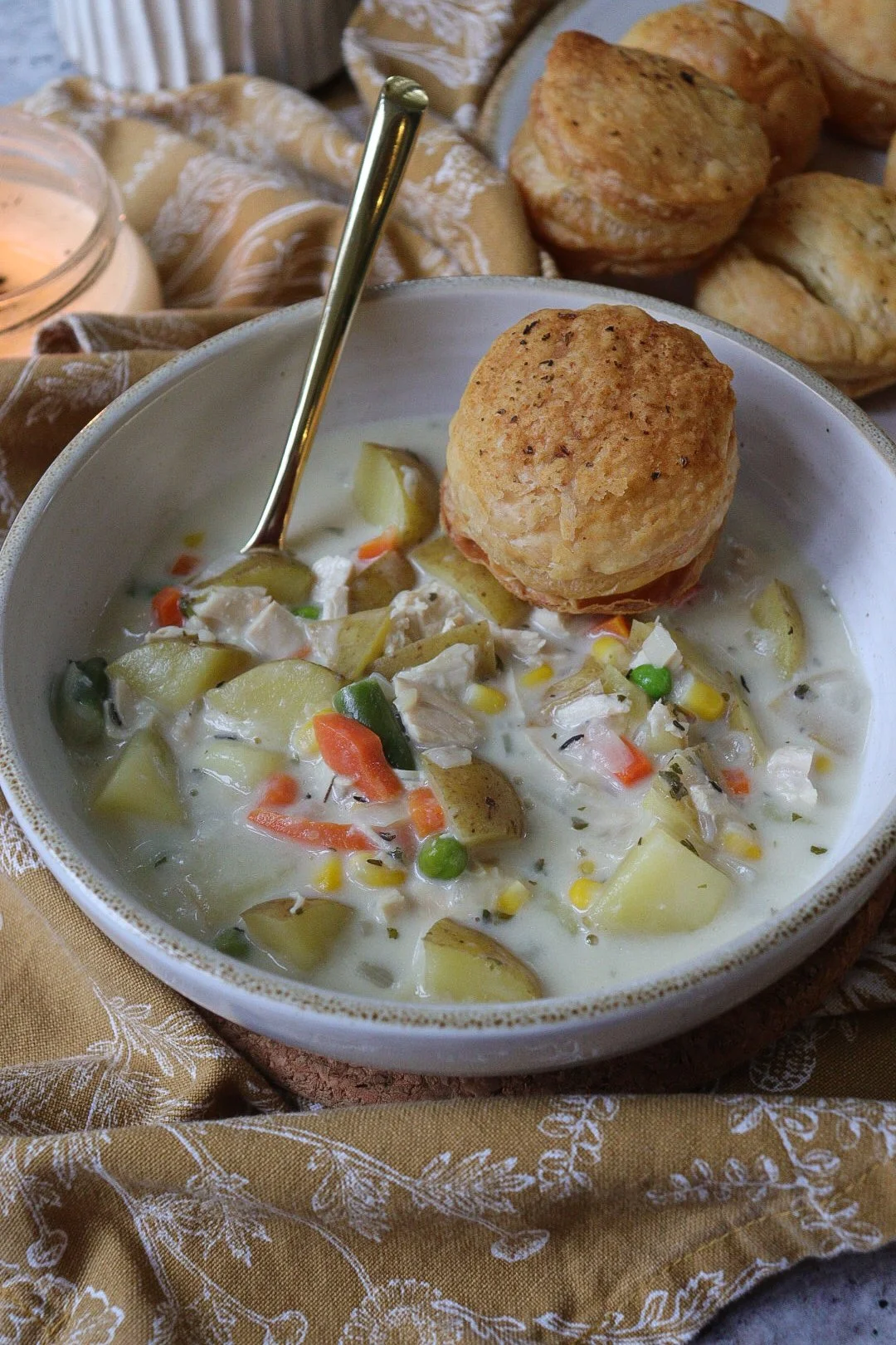 Loaded Chicken Pot Pie Soup with Flaky Puff Pastry Bites