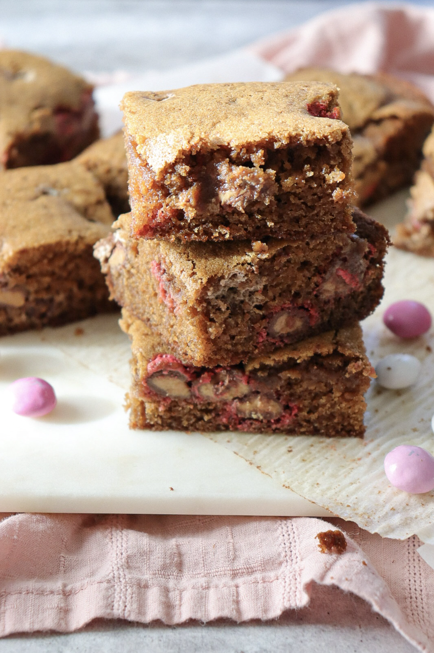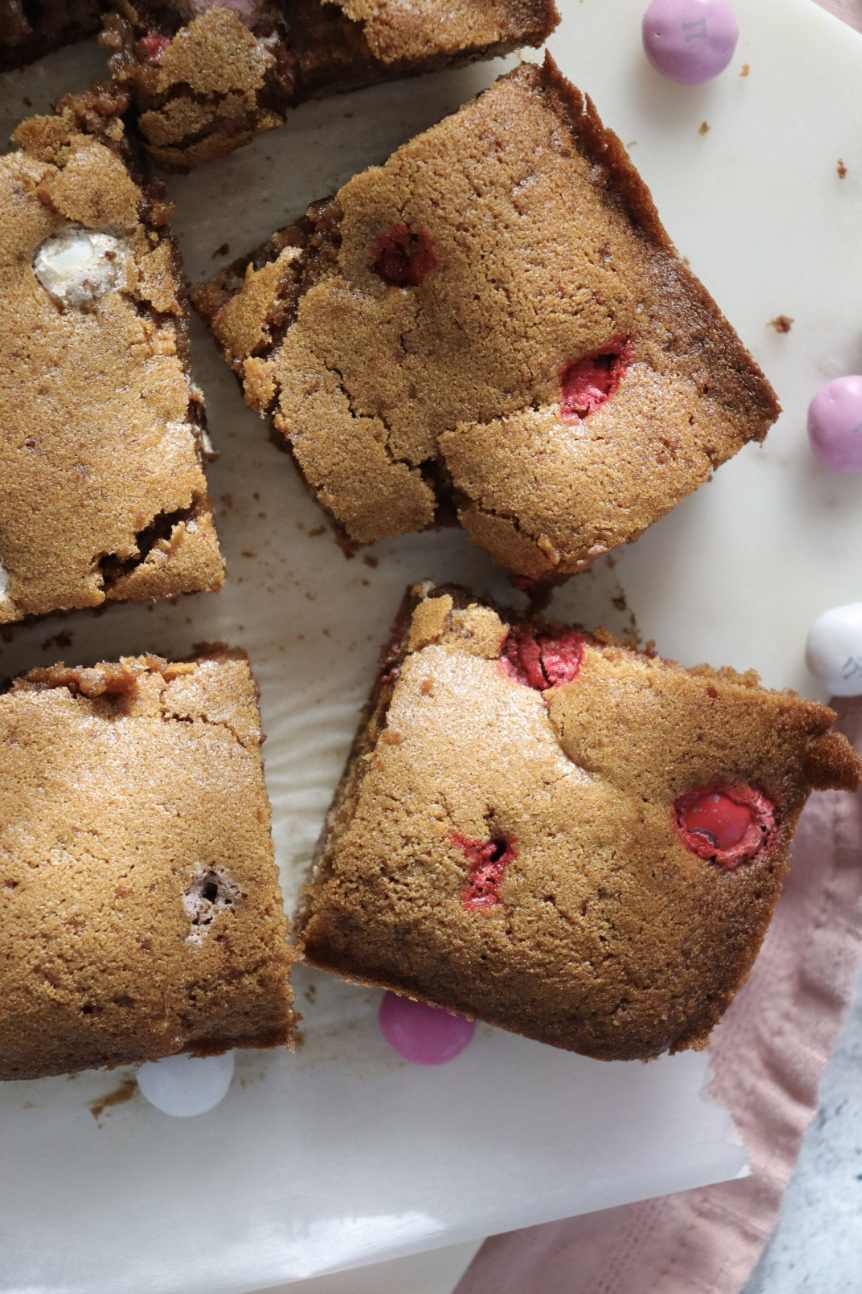 These peanut butter M&M bars are a dream! I have made a few different versions of this bar, including this cute mummy version for Halloween, but I have to say - this is my favorite one yet. I kept this Valentine’s Day themed by using red, white, and pink peanut butter M&Ms. I looove how the peanut butter gets melty and gooey, it’s just so good. These bars are also gluten free! I personally am not gluten free, but I do love baking with cassava flour. I think it gives a really fluffy texture to baked goods. Find the video for this recipe here!