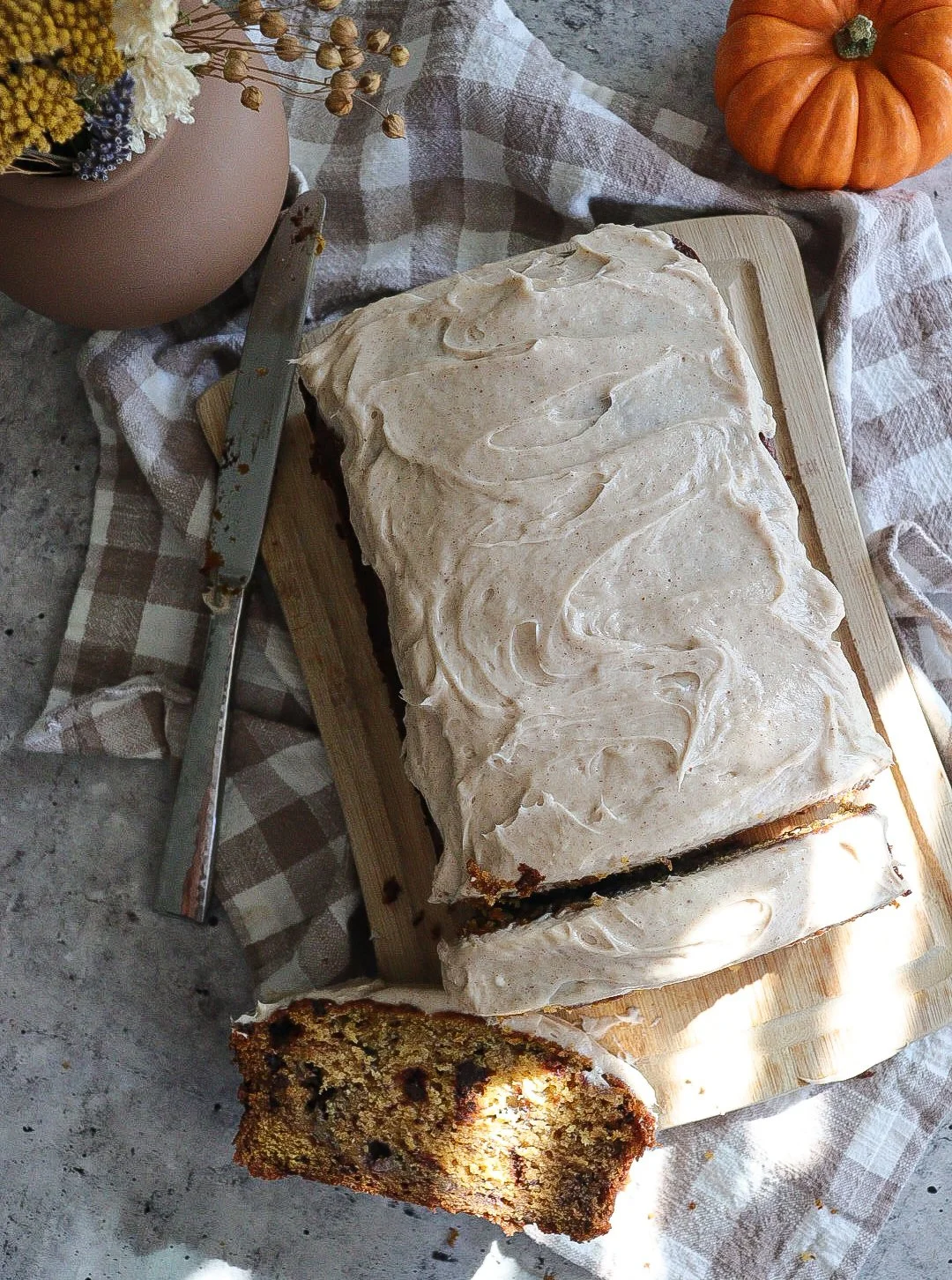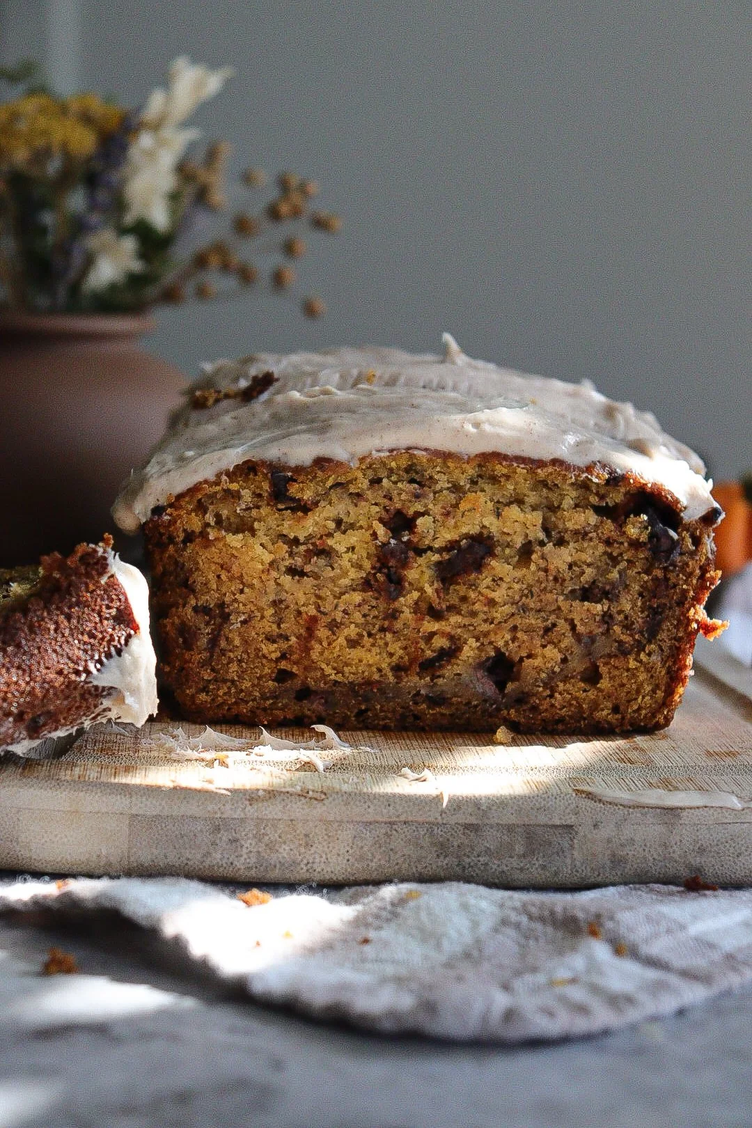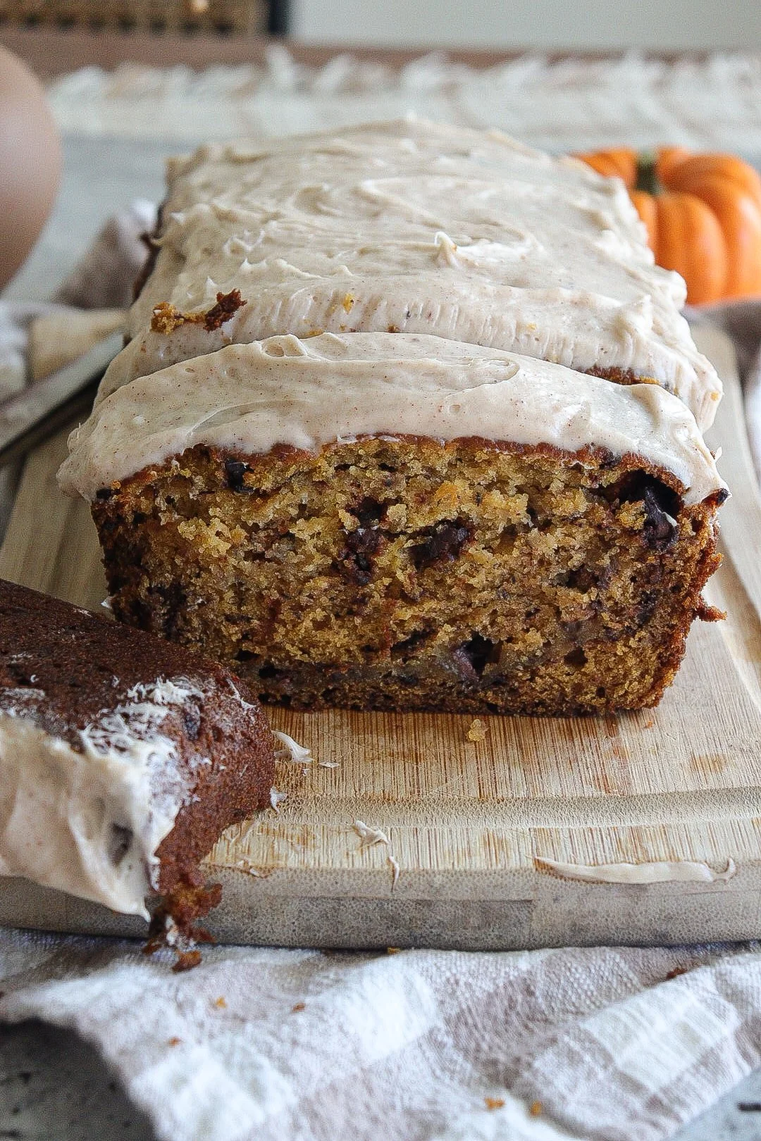 Pumpkin Banana Bread with Chocolate Chunks and Pumpkin Spice Cream Cheese Frosting