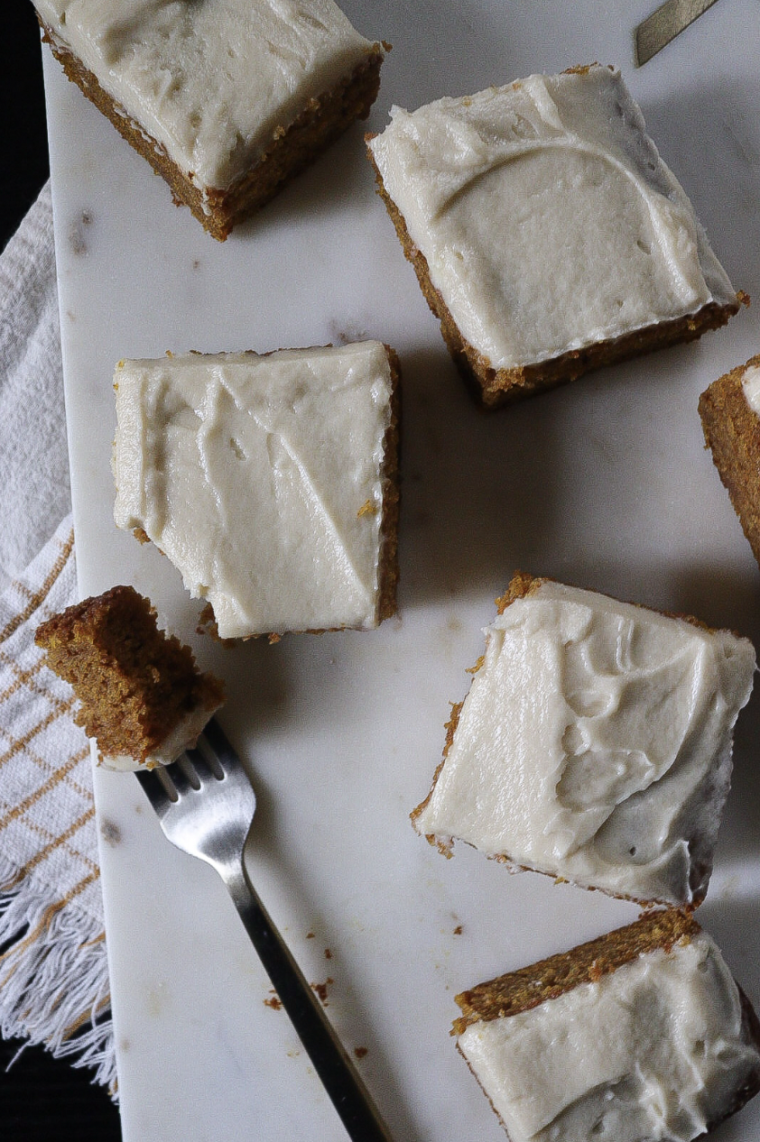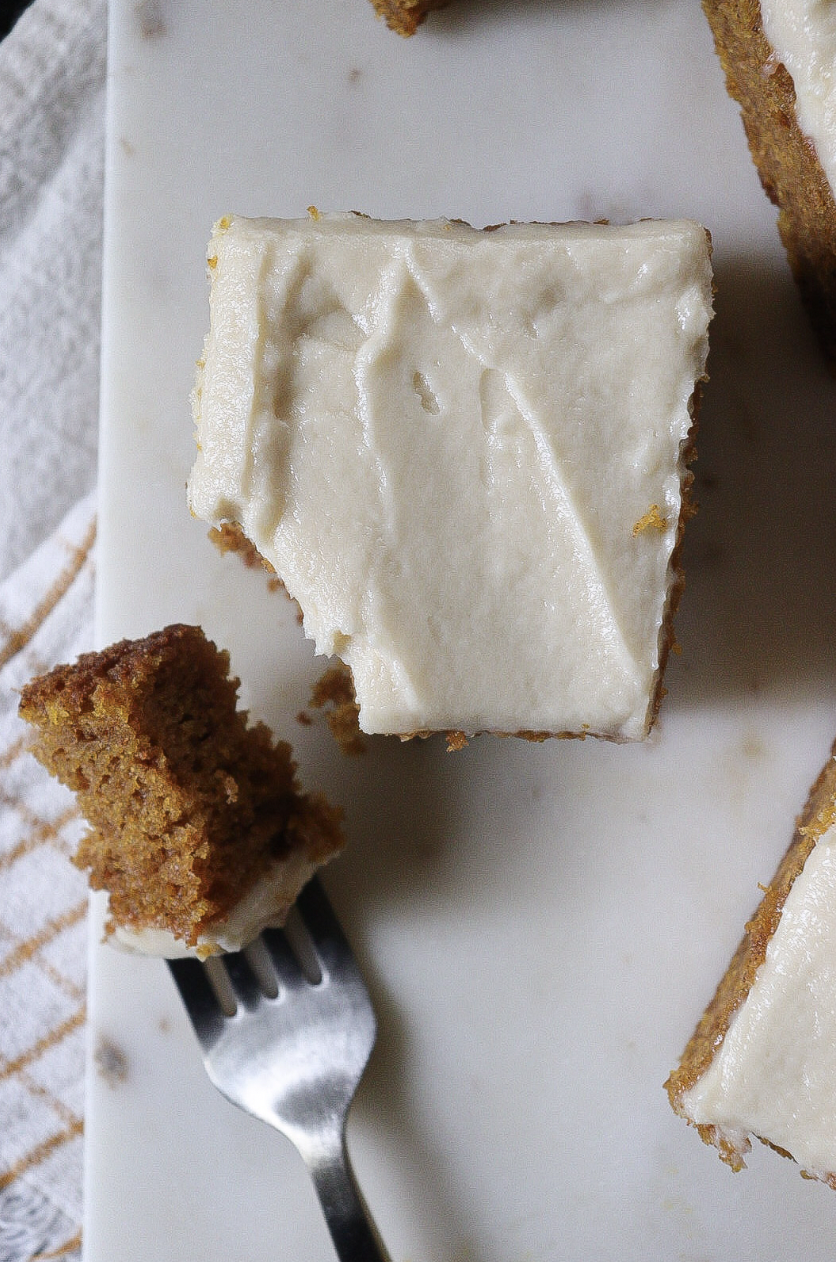 That leads me right to this recipe. It truly is THE recipe of the season. I first made this recipe when I lived in San Diego a couple of years ago, and let me tell you it just hits different when it’s actually cool outside while you’re eating it. The cake itself is super moist and has such a good flavor from the pumpkin puree and pumpkin spice seasoning. It’s perfectly complimented with the cream cheese frosting that mellows out the spices. Not to mention, it’s so easy to make. Sometimes baking feels intimidating to me, but trust me you can’t mess up this cake. It comes together quickly and you will want it on repeat for each upcoming holiday… or just for the heck of it.