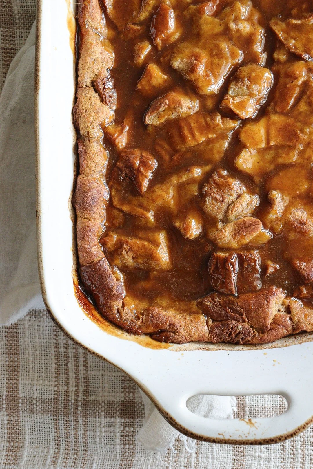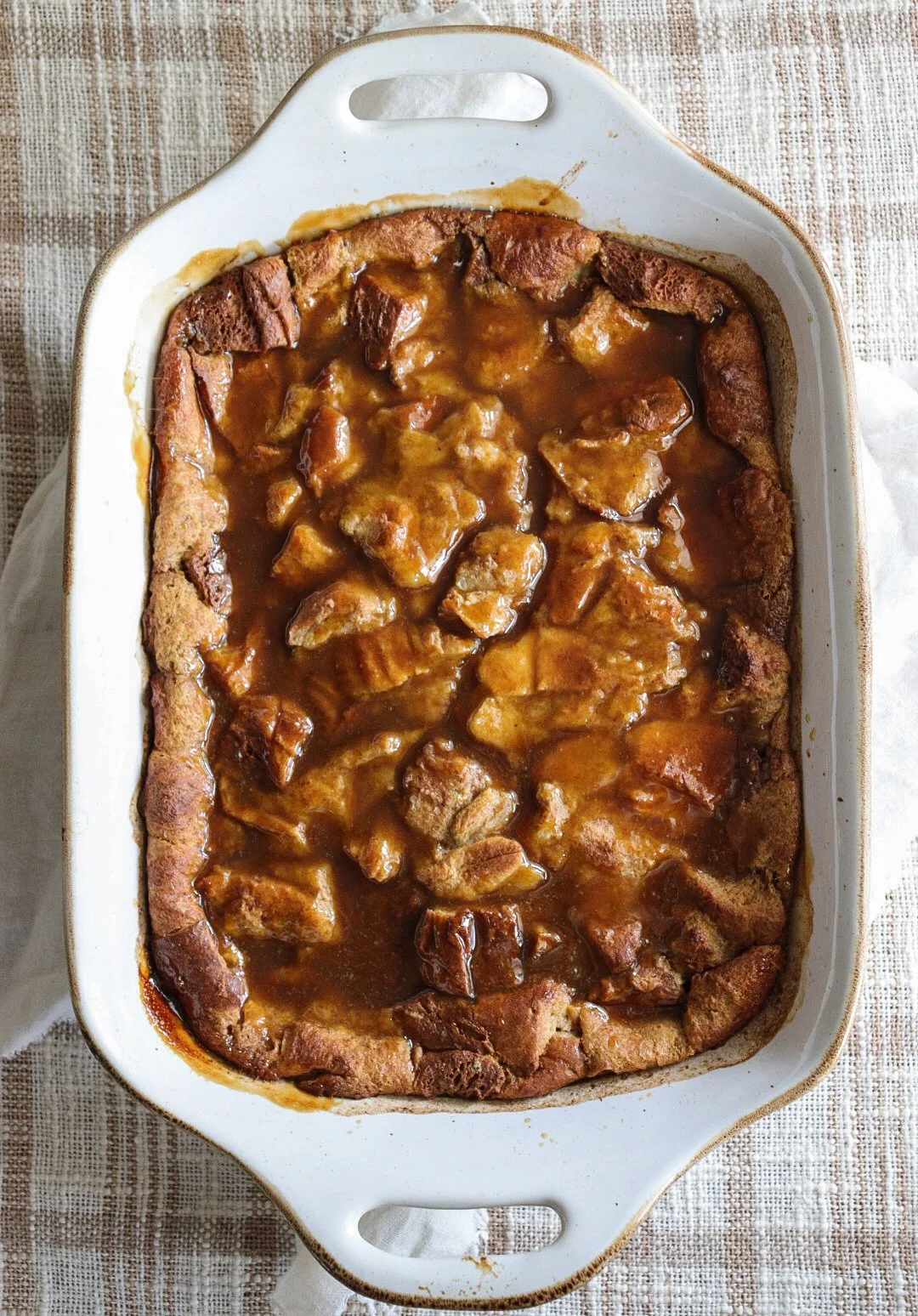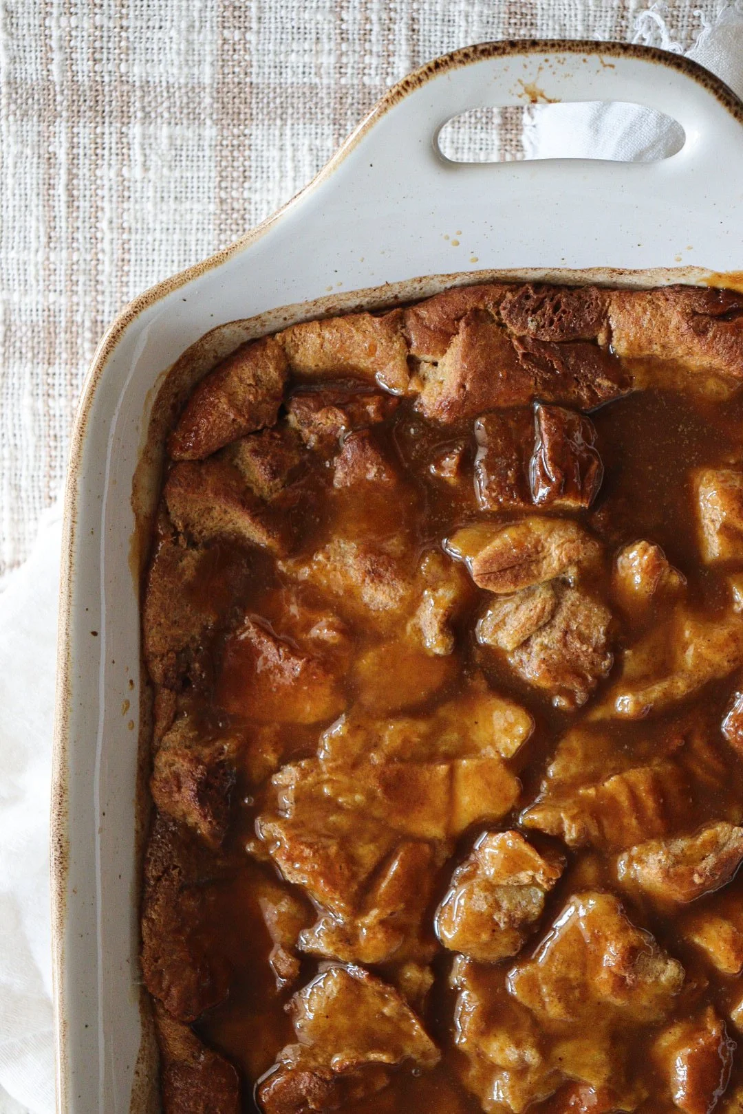 - When the bread pudding is done and cooling, prepare the sauce by whisking together all ingredients in a sauce pan over medium heat. Bring to a low boil, continuing to whisk, and then remove from heat. Let cool about 2 minutes and then pour on top of the bread casserole. Use a spatula or gently lift and turn the casserole dish to spread out evenly.