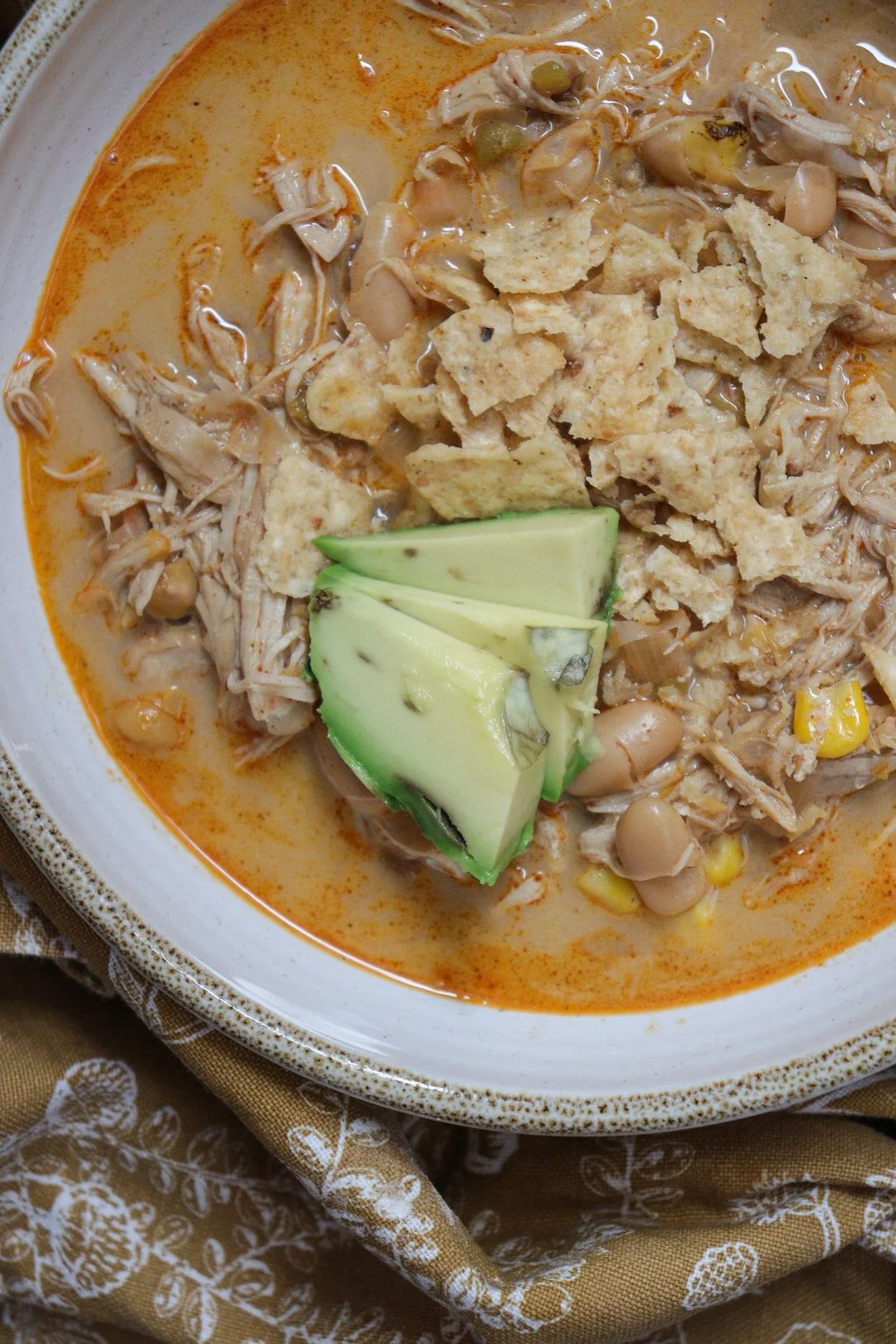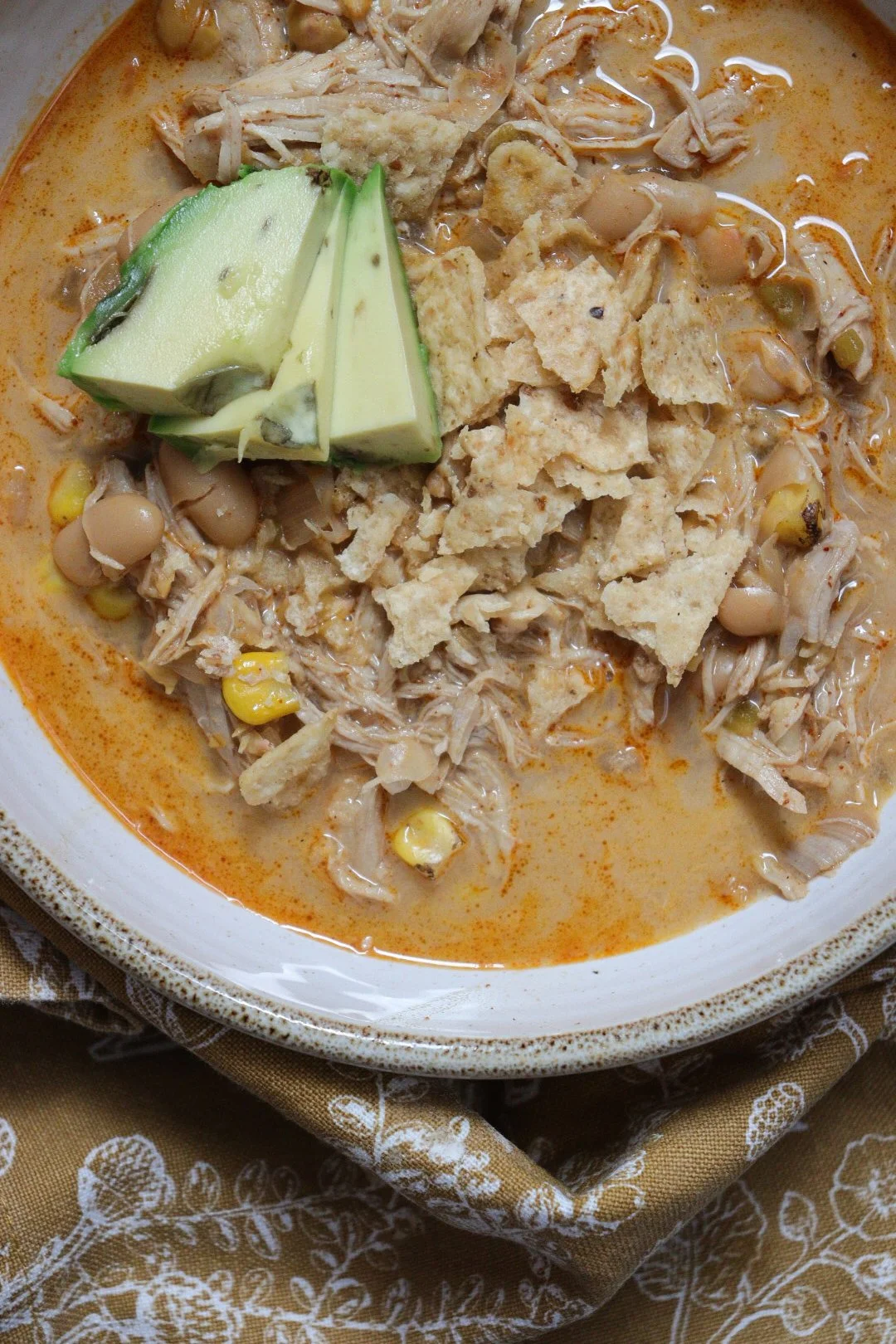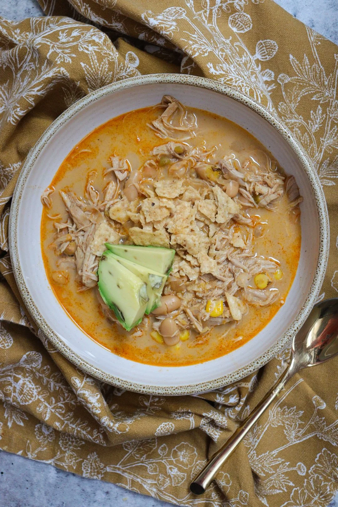 It is finally starting to feel like fall, and I am so ready for it! After our first brutally hot summer in Georgia, I have never been more ready for cooler temps. Although, I’ve always loved fall! The cooler temps, the crisp cool air, and of course the fun fall decorations! Now that it’s October I am fully leaning into the season. Which means crockpot meals here we come! I love throwing meals in a crockpot because they always have so much flavor and they are super low maintenance. You likely already have a lot of of the ingredients sitting around at home needed to make this recipe. I used boneless skinless chicken thighs that turned super tender, and added chili powder and cumin to give it a delicious flavor. It also has cannellini beans and a can of smashed chickpeas to thicken the soup, plus add some fiber and protein. The green chiles, fire roasted corn, and onion really bring it all together! It’s all simmered in vegetable broth, and towards the end you’ll add some cream to make it a cozy soup that you can curl up with on a cool evening. I enjoy it topped with crushed tortilla chips and avocado. Hope you love this as much as I do!